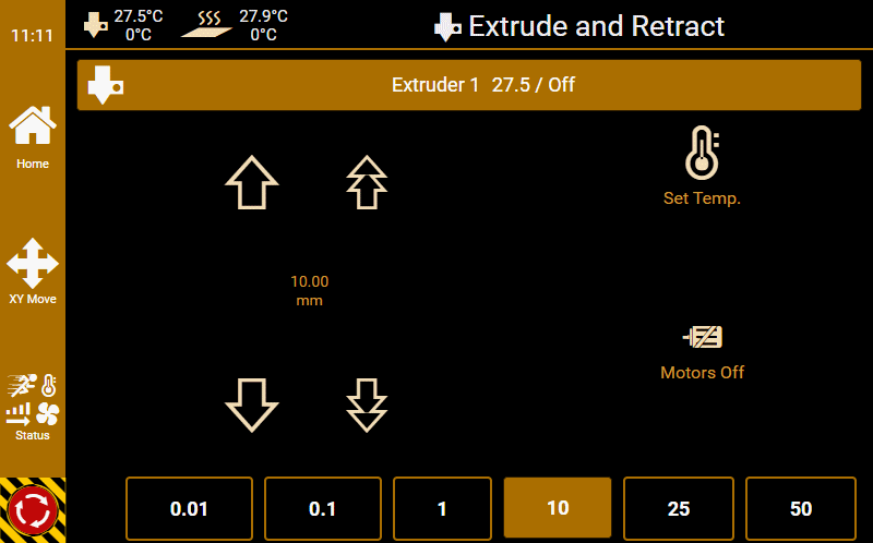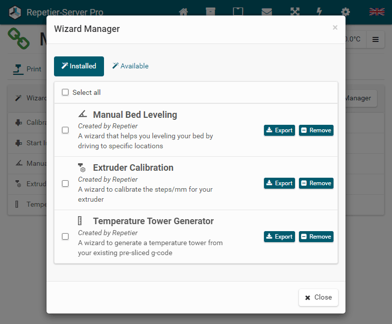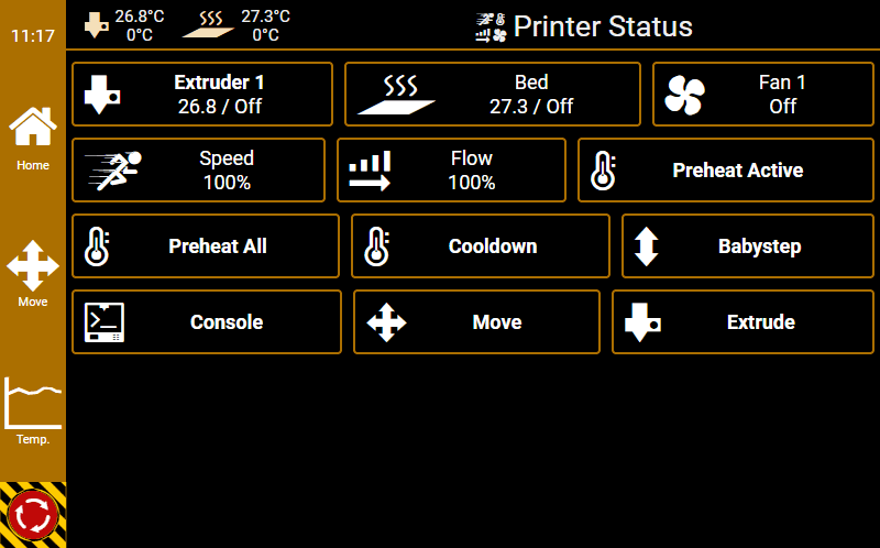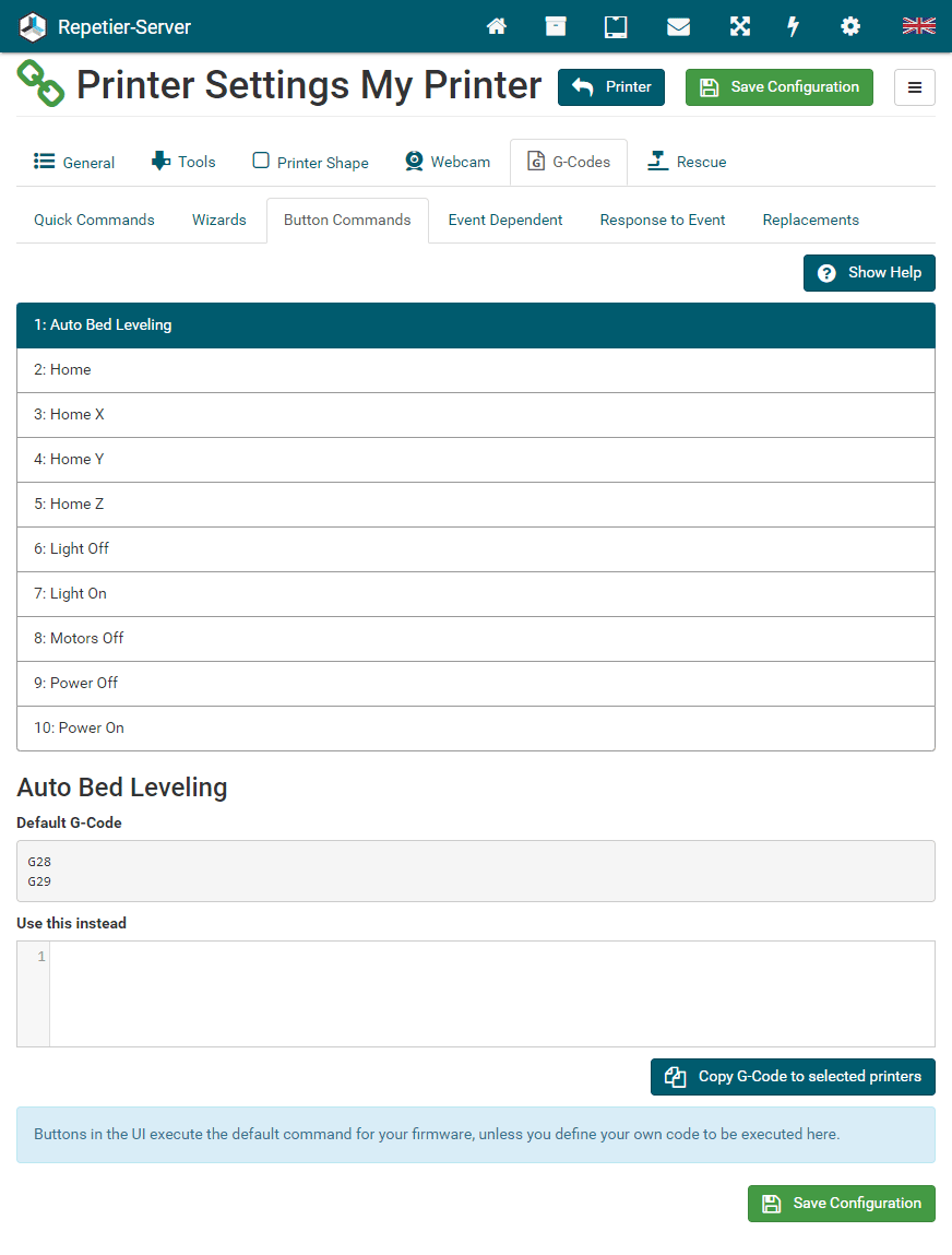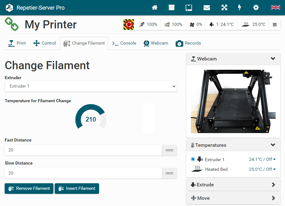G0 X<xpos> Y<ypos> Z<zpos> E<epos> F<feedrate>G1 X<xpos> Y<ypos> Z<zpos> E<epos> F<feedrate>G4G10 S<1 = long retract, 0 = short retract = default>G11 S<1 = long retract, 0 = short retract = default>G20G21G28G29 S<0..2>G30 P<0..3>G31G32 S<0..2> P<0..1>G90G91G92G131G132G133G134 Px Sx ZxG201 P<motorId> X<pos>G202 P<motorId> X<setpos>G203 P<motorId>G204 P<motorId> S<0/1>M104M105M106M107M109M114M3M4M5M20M21M22M23M24M25M26M27M28M29M30 <filename>M32 <dirname>M42 P<pin number> S<value 0..255>M80M81M82M83M84M85M92M99 S<delayInSec> X0 Y0 Z0M104 S<temp> T<extruder> P1 F1M105 X0M112M115M116M117 <message>M119M140 S<temp> F1M163 S<extruderNum> P<weight>M164 S<virtNum> P<0 = dont store eeprom,1 = store to eeprom>M190M200 T<extruder> D<diameter>M201M202M203M204M205M206M207 X<XY jerk> Z<Z Jerk> E<ExtruderJerk>M209 S<0/1>M220 S<Feedrate multiplier in percent>M221 S<Extrusion flow multiplier in percent>M226 P<pin> S<state 0/1>M231 S<OPS_MODE> X<Min_Distance> Y<Retract> Z<Backlash> F<ReatrctMove>M232M233 X<AdvanceK> Y<AdvanceL>M251M280 S<mode>M281M300 S<Frequency> P<DurationMillis>M302 S<0 or 1>M303 P<extruder/bed> S<printTemerature> X0M320M321M322M323 S0/S1M340 P<servoId> S<pulseInUS>M350 S<mstepsAll> X<mstepsX> Y<mstepsY> Z<mstepsZ> E<mstepsE0> P<mstespE1>M355 S<0/1>M360M400M401M402M408 S<0-5>M450M451M452M453M460 X<minTemp> Y<maxTemp>M500M501M502M513M600M601 S<1/0>M602 S<1/0> P<1/0>M603M604 X<slowdownSteps> Y<errorSteps> Z<slowdownTo> T<extruderId>M908 P<<address> S<value>M999Repetier-Server Pro supports the guided installation of the firmware Klipper on your devices. To install Klipper, select the Klipper firmware during printer creation. The button Install appears. When you click this button, a menu appears that installs all dependencies and installs Klipper properly. Note that the default path of the installation is not /home/pi/klipper as in a normal installation but /opt/klipper/SLUG and this directory belongs to the user "repetierserver" and is therefore not accessible with the user pi.