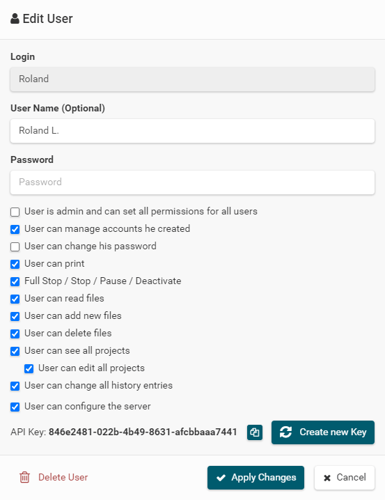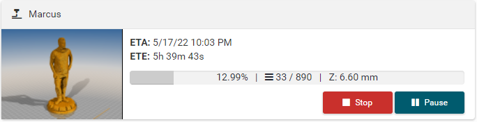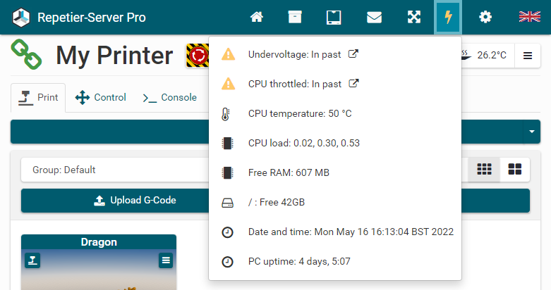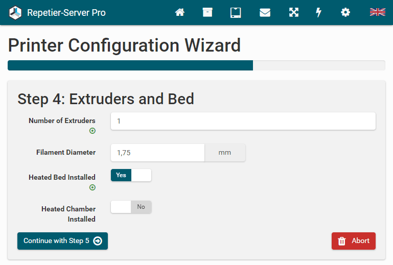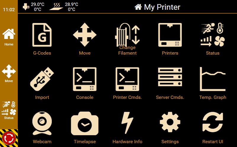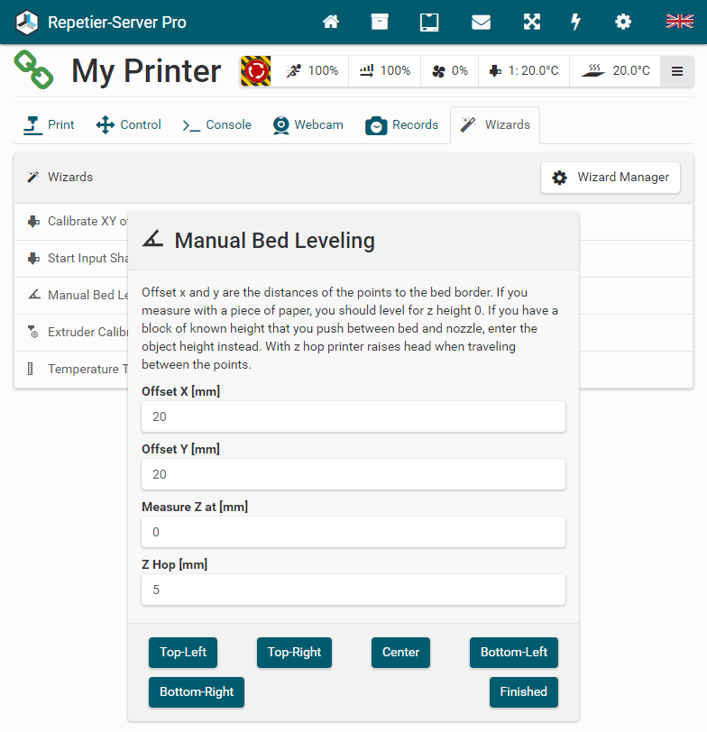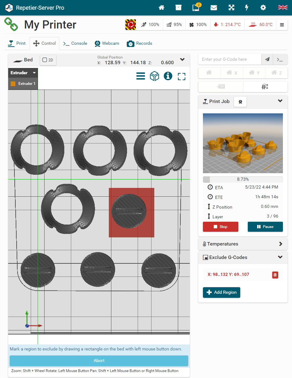 G0 X<xpos> Y<ypos> Z<zpos> E<epos> F<feedrate>G1 X<xpos> Y<ypos> Z<zpos> E<epos> F<feedrate>G4G10 S<1 = long retract, 0 = short retract = default>G11 S<1 = long retract, 0 = short retract = default>G20G21G28G29 S<0..2>G30 P<0..3>G31G32 S<0..2> P<0..1>G90G91G92G131G132G133G134 Px Sx ZxG201 P<motorId> X<pos>G202 P<motorId> X<setpos>G203 P<motorId>G204 P<motorId> S<0/1>M104M105M106M107M109M114M3M4M5M20M21M22M23M24M25M26M27M28M29M30 <filename>M32 <dirname>M42 P<pin number> S<value 0..255>M80M81M82M83M84M85M92M99 S<delayInSec> X0 Y0 Z0M104 S<temp> T<extruder> P1 F1M105 X0M112M115M116M117 <message>M119M140 S<temp> F1M163 S<extruderNum> P<weight>M164 S<virtNum> P<0 = dont store eeprom,1 = store to eeprom>M190M200 T<extruder> D<diameter>M201M202M203M204M205M206M207 X<XY jerk> Z<Z Jerk> E<ExtruderJerk>M209 S<0/1>M220 S<Feedrate multiplier in percent>M221 S<Extrusion flow multiplier in percent>M226 P<pin> S<state 0/1>M231 S<OPS_MODE> X<Min_Distance> Y<Retract> Z<Backlash> F<ReatrctMove>M232M233 X<AdvanceK> Y<AdvanceL>M251M280 S<mode>M281M300 S<Frequency> P<DurationMillis>M302 S<0 or 1>M303 P<extruder/bed> S<printTemerature> X0M320M321M322M323 S0/S1M340 P<servoId> S<pulseInUS>M350 S<mstepsAll> X<mstepsX> Y<mstepsY> Z<mstepsZ> E<mstepsE0> P<mstespE1>M355 S<0/1>M360M400M401M402M408 S<0-5>M450M451M452M453M460 X<minTemp> Y<maxTemp>M500M501M502M513M600M601 S<1/0>M602 S<1/0> P<1/0>M603M604 X<slowdownSteps> Y<errorSteps> Z<slowdownTo> T<extruderId>M908 P<<address> S<value>M999Repetier-Server Pro supports the guided installation of the firmware Klipper on your devices. To install Klipper, select the Klipper firmware during printer creation. The button Install appears. When you click this button, a menu appears that installs all dependencies and installs Klipper properly. Note that the default path of the installation is not /home/pi/klipper as in a normal installation but /opt/klipper/SLUG and this directory belongs to the user "repetierserver" and is therefore not accessible with the user pi.