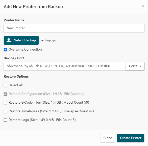 the restore options, if you just want to restore the Configuration or g-codes files, timelapses and Logs.